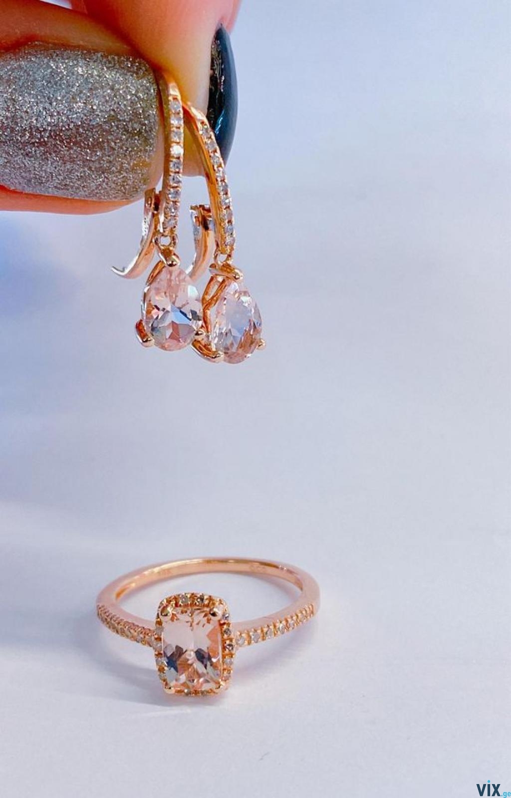 იტალიური ქარხნული ბარდისფერი ოქროს სამეული, 14k (585) სინჯი, ბრილიანტებით და ვარდისფერი ტოპაზებით, 4,4 გრამი, ბრილიანტები ჯამში 0,30 სოტკა. ბეჭდის ზომა 17,5, 1450 ლარი